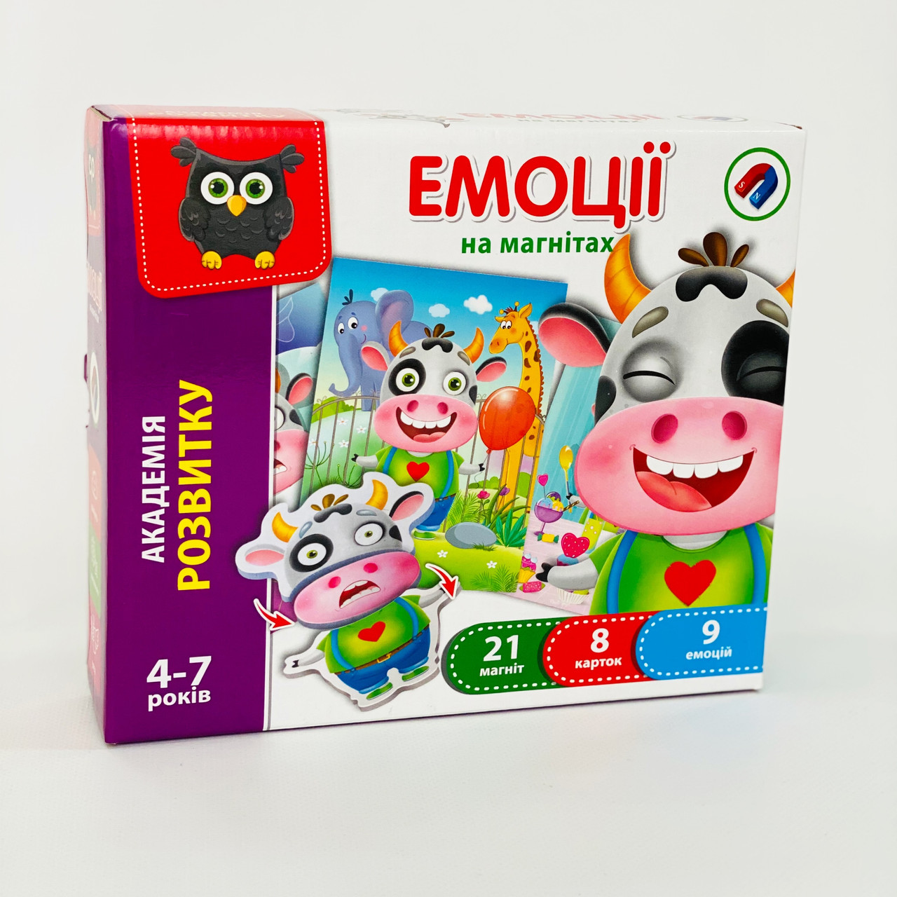 Емоції на магнітах – це історія про маленького бичка Боббі, який на кожну ситуацію реагує дуже емоційно! Він допоможе малюкові дізнатися багато цікавого про захопливий світ емоцій. Малюкові потрібно підібрати до картки-ситуації відповідну емоційну реакцію. Наприклад, картка, на якій Боббі святкує свій День народження. Тут він щасливий. Підбираємо магніти, на яких зображено посмішку та зщурені від радості очі. Готово! На іншій картці Боббі лежить у своєму ліжечку. Йому наснився страшний сон. Підбираємо магнітики зі зляканим виразом обличчя і т. д.
